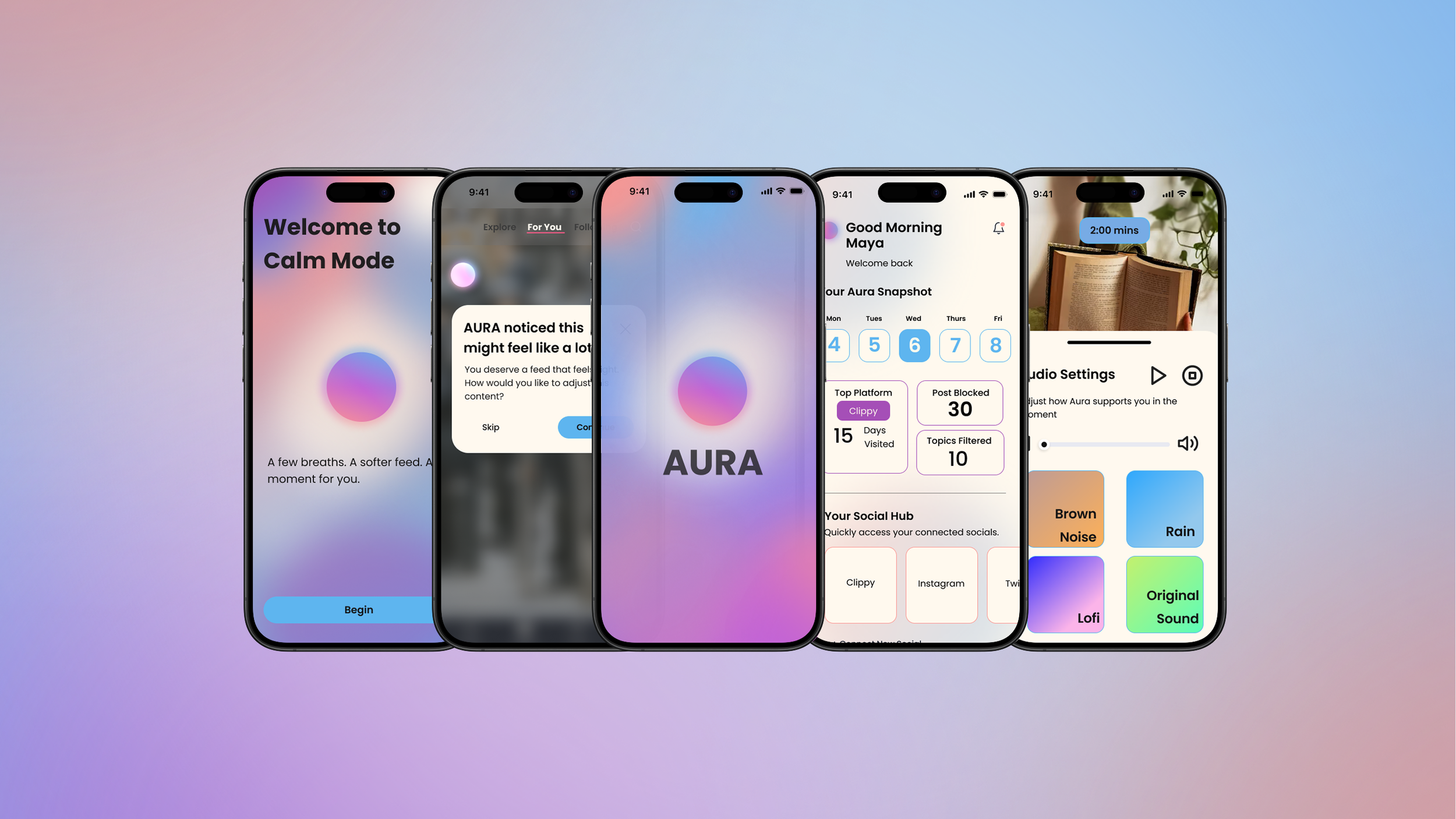 AURA is a digital wellbeing tool that helps people feel safer on social media. As an overlay, it acts as a protective layer that blocks unwanted content, allows users to curate their feed, and provides calming tools that help users take control and emotionally regulate—all without forcing them to completely disconnect.